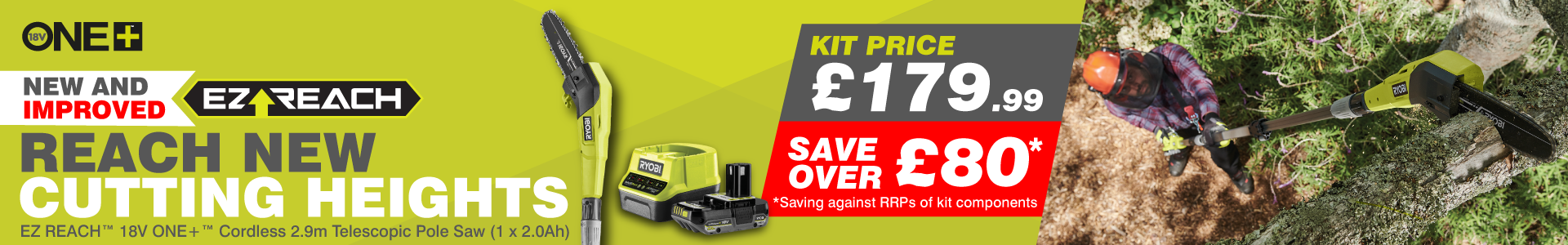 The RY18PP20A-120 is a starter kit and includes the EZ REACH™ 18V ONE+™ 2.9m Telescopic Pole Saw, 1 x 2.0Ah battery and 1 x charger.