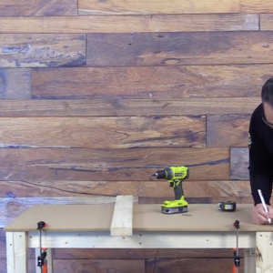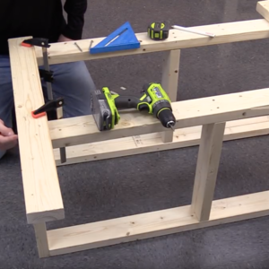 Center the sheet of MDF/Plywood on the frame. Mark the table top in 9 spots (3 on each side, and 3 down the middle) where you are going to fasten the top and pre-drill with countersink bit. Note: you can use a piece of scrap wood to help you mark the center points (as mentioned in video). Fasten the table top to frame with screws. (Helpful Hint: be sure to align your center fastener with the center support underneath the table top)