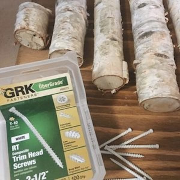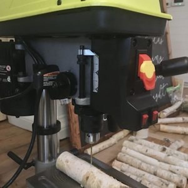 Take the birch over to the drill press to drill pilot holes for the screws. This worked very well, given the shape of the birch being round, the drill press makes sure the pilot hole is straight up and down.