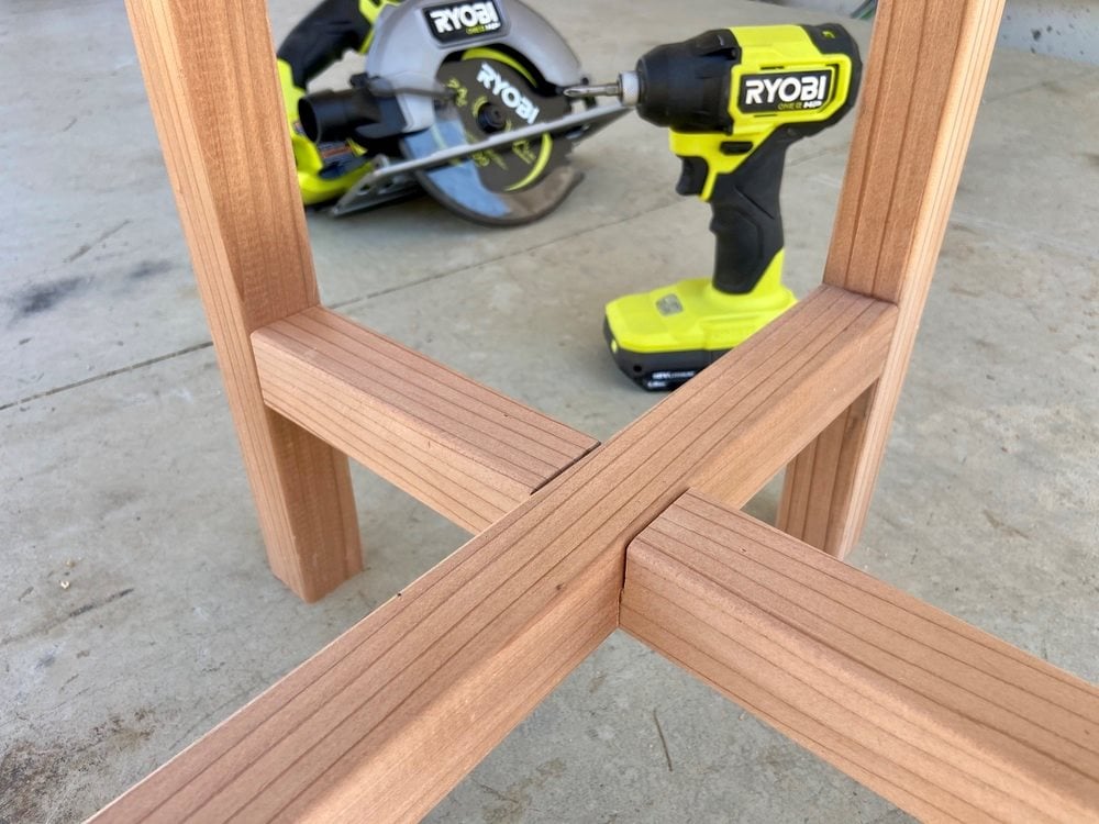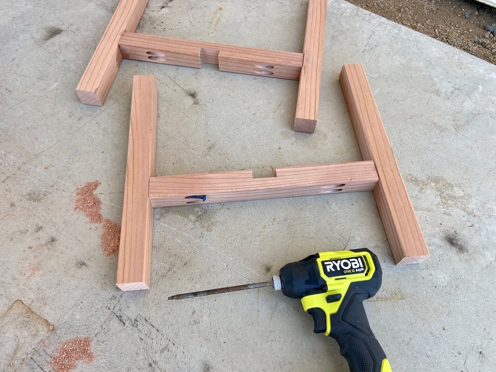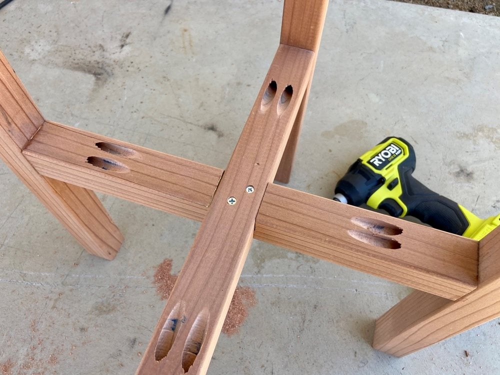 Secure the 26cm pieces to the 36cm ‘leg’ pieces at approx. 11cm from the bottom of each leg. Then align the notches on the 13 3.2mm pieces and secure with glue and screws from the underside (same side as the pocket holes). Finish with a stain, oil based urethane and or linseed oil or a similar preservative treatment. Once dry you’ll be ready to add your potted plant and enjoy!