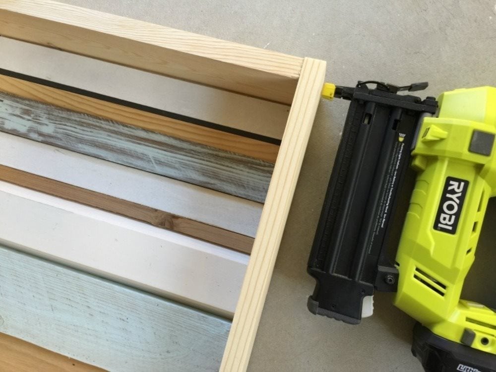 Next, glue the pieces onto the plywood backing, using heavy objects to clamp the wood strips down. Leave 19mm of space all the way around so the frame can be “sandwiched” between the front and back pieces of plywood.
