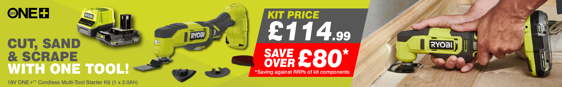 The RMT18-1C20GL kit includes a ONE+™ Multi-tool, a 2.0Ah battery and charger